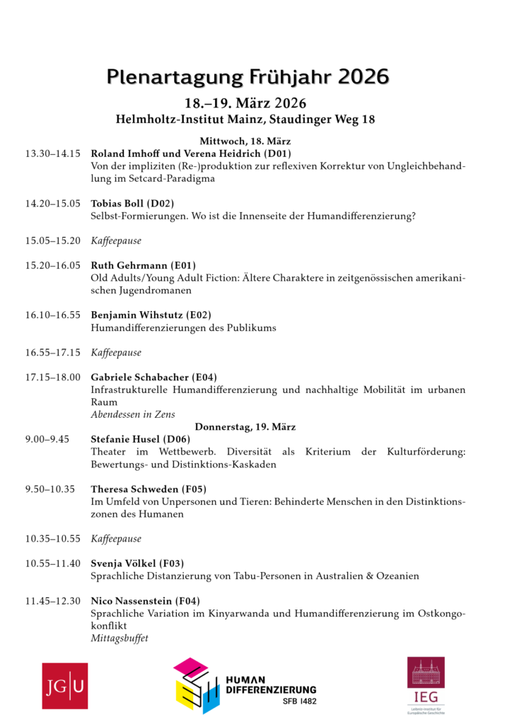 Humandifferenzierung Die Einrichtung des SFB 1482 „Humandifferenzierung“ an der Johannes Gutenberg-Universität Mainz und dem Leibniz-Institut für Europäische Geschichte (IEG) wurde zum 1.7.2021 von der Deutschen Forschungsgemeinschaft (DFG) bewilligt.